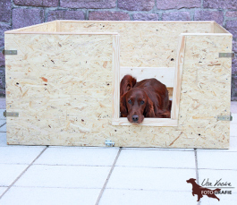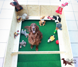 Die Wurfkiste ist fertig, Herrchen hat eine komfortable Wurfstätte gebaut. Medy hat sie wohlwollend begutachtet und einem Probeliegen zugestimmt. Nachdem einige Kuscheltiere zur Deko die Geburtskiste schmückten war Fotoshooting angesagt.